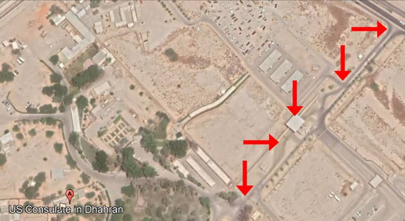 كذلك تظهر المشكلة عند مداخل المناطق ذات الحراسة الأمنية وعدم تمييزها عن المناطق العادية. وأيضا بعد عبور المداخل تكون حركة السيارات غير موجهة بشكل آمن بشكل نحو الوجهة. شكل 1-15