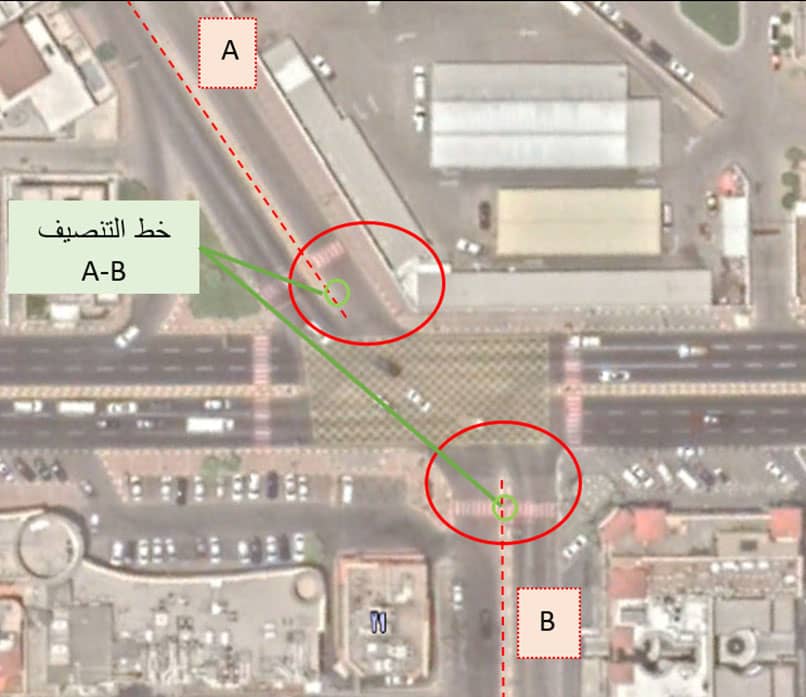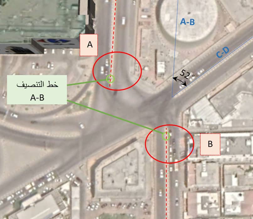 في شكل1-5  يظهر تقاطع الشارعين A- الطبري مع شارع B- فهد بن سلمان و الواقع في مدينة الخبر حيث يقابل الشارع A الشارع B مما يستوجب ان يكون خط التصنيف لهم مشترك ويعبر عبرهم بخط مستقيم، إلا أنه يظهر أنهما لا يشتركان في نفس خط التنصيف ولا يقطعهما بشكل مستقيم مما يجعله تقاطع غير منتظم.
