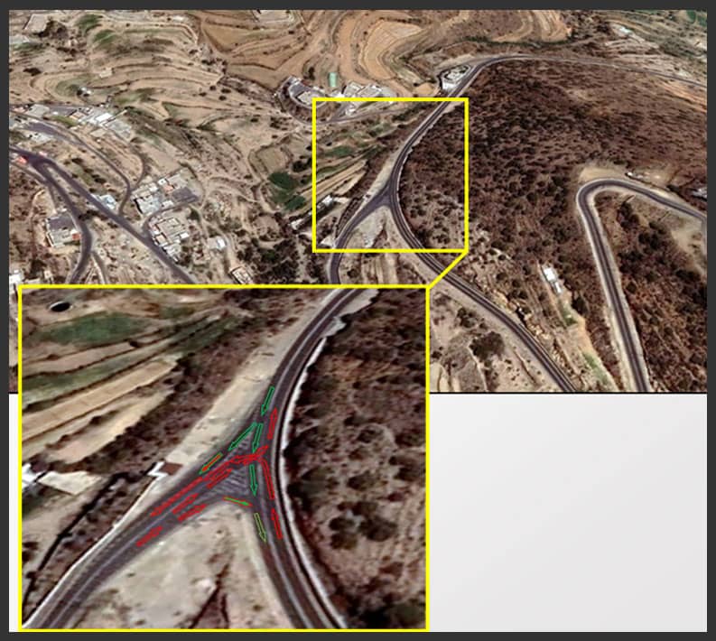 على سبيل المثال في منطقة عسير-مدينة أبها حيث التضاريس المتنوعة والطرق السياحية تتضح هذه المشكلة في طريق بني مازن-السودة في أحد المنعطفات حيث تتواجد تداخلات مرورية كثيرة ويصعب التعرف عليها في المساء تحديدًا. شكل 1-14