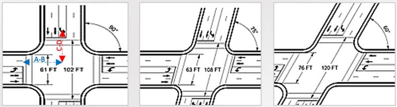 درجة محاذاة التقاطع تكون ° 90قدر المستطاع ولا تقل عن 60° إذا تعذر ذلك، هذا النطاق تم تحديده من قبل (AASHTO) شكل 1-2
